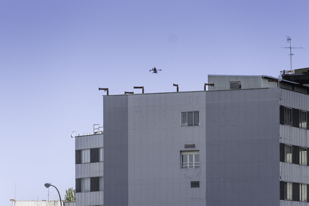 El dron de Bluenest, en el momento previo a aterrizar en el edificio del Hospital de La Paz